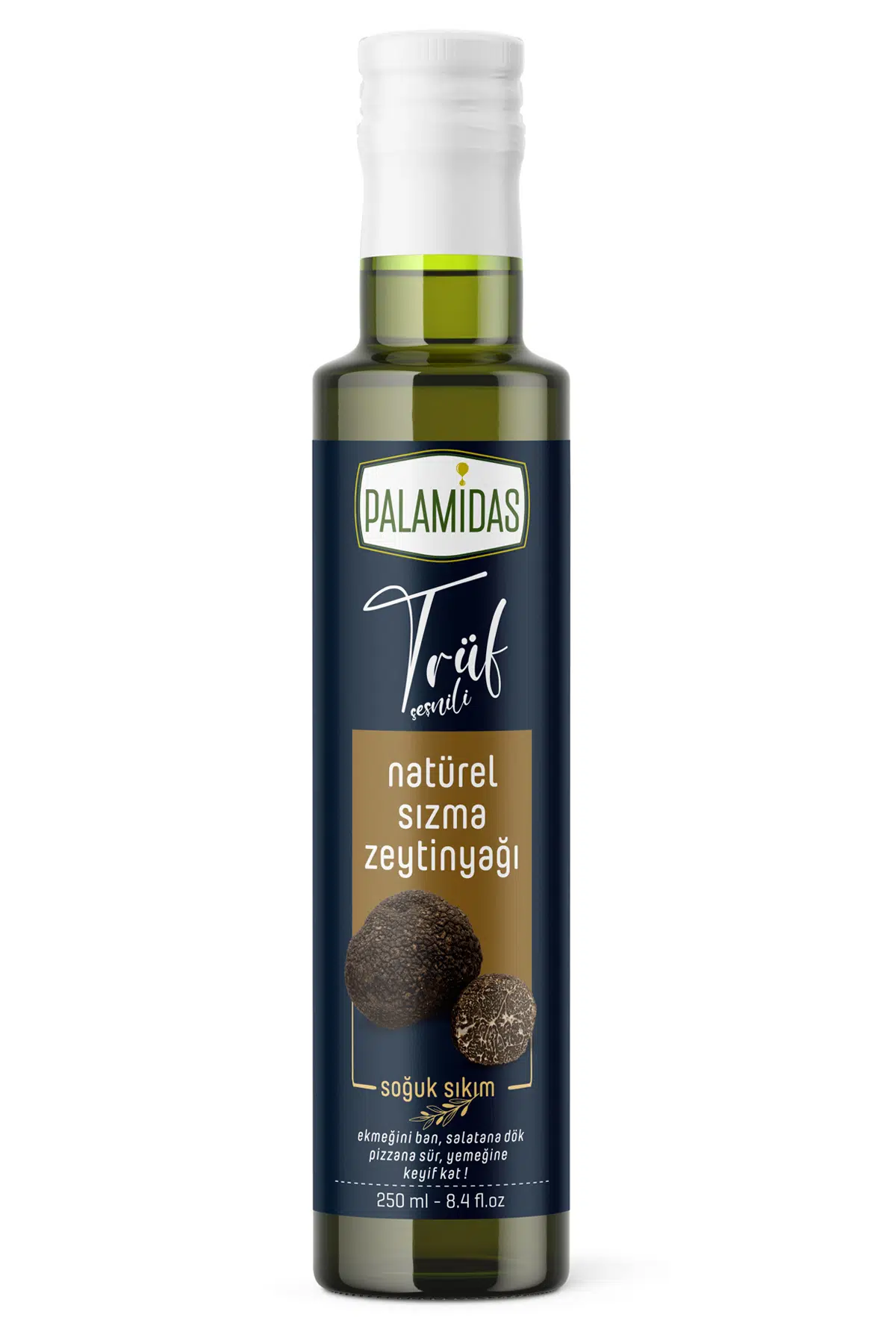 Trüf mantarı, bulunması en zor ve en değerli doğal lezzetlerden biridir. Toprağın derinliklerinde saklı bu gizemli aromayı, zeytin ağacının bereketiyle harmanladık. Palamidas olarak amacımız, sadece restoranlarda tadabileceğiniz o büyüleyici gastronomi deneyimini mutfağınıza taşımaktı. Siyah trüfün topraksı kokusu şişeyi açtığınız anda mutfağınızı sarsın diye, her damlayı tutkuyla hazırladık.
